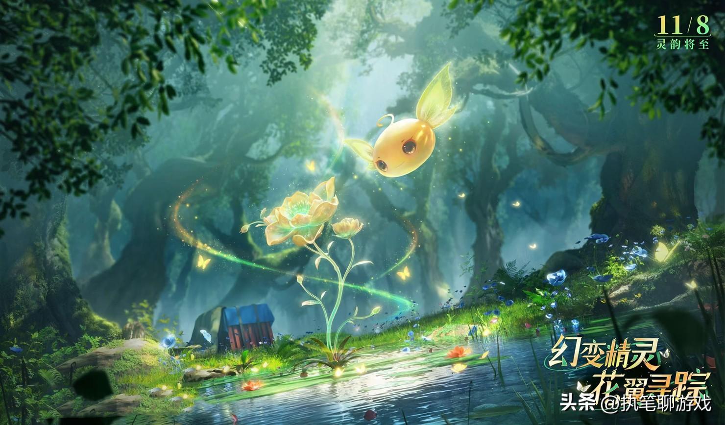 如圖所示,在這張懸念海報裏,我們可以看到金黃色的花朵,旁邊還出現了一個可愛的金色精靈,右下角寫着“幻變精靈,花翼尋蹤”這8個字,右上角寫着“11.8靈韻將至”。