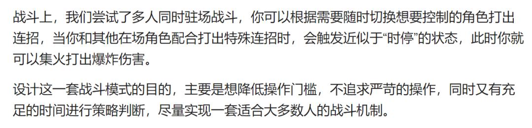 同時切人、角色必殺、集火狀態都有對應的動畫演出,整體觀感不錯;但也有玩家吐槽,表示相對其他模塊,遊戲戰鬥部分缺乏新意,不夠吸引人。
