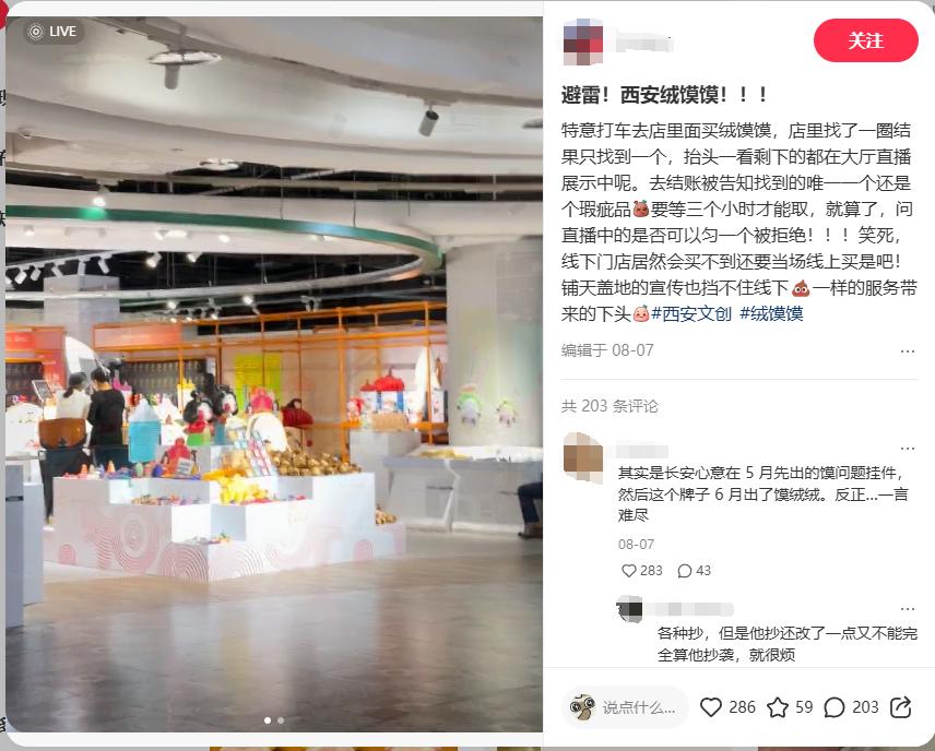 同樣拿“絨饃饃”舉例,曾經有網友準備去線下購買,卻發現商品全在大廳直播間裏展示,無法購買,而店內唯一能購買的還是個瑕疵品……