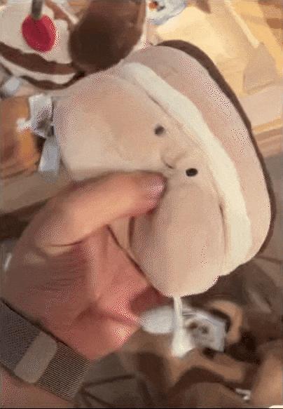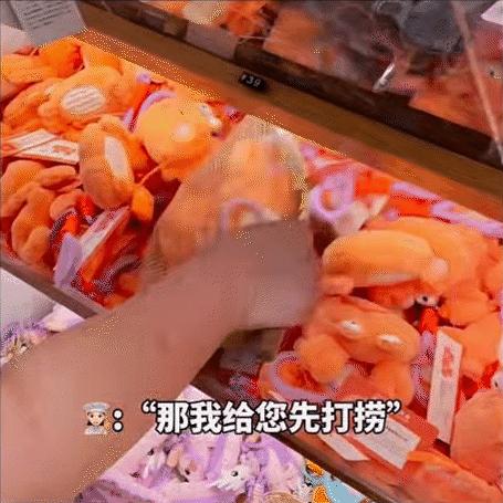 除了拿鐵玩偶之外、現場售賣其他的毛絨玩偶,同樣會有這麼一套儀式感十足的歡送表演,並且,店員們還會根據玩偶的造型、顧客的需求來調整表演和臺詞。