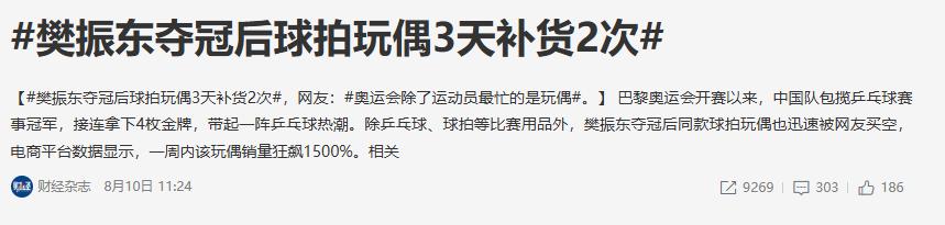 本身售價只在299元的乒乓球拍毛絨玩具,在樊振東奪冠之後直接賣到斷貨下架,“樊振東奪冠後球拍玩偶3天補貨2次”的話題還衝上微博熱搜榜。