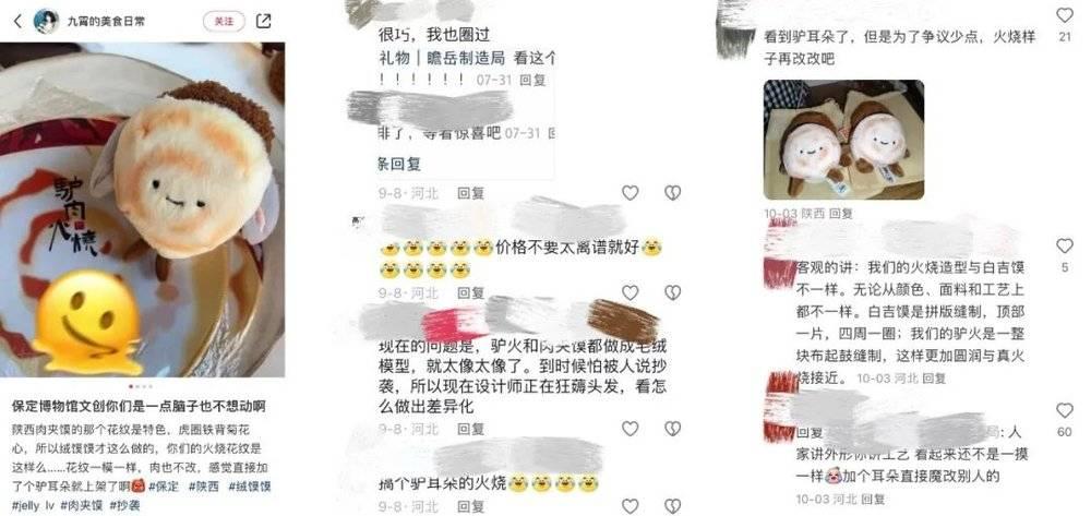 設計抄襲、敷衍,想賺快錢的店家開始出現。比如保定的驢肉火燒文創,就被網友們質疑抄襲了陝西的“絨饃饃”,實物看上去除了加了驢耳朵之外,確實也和“絨饃饃比較相似。