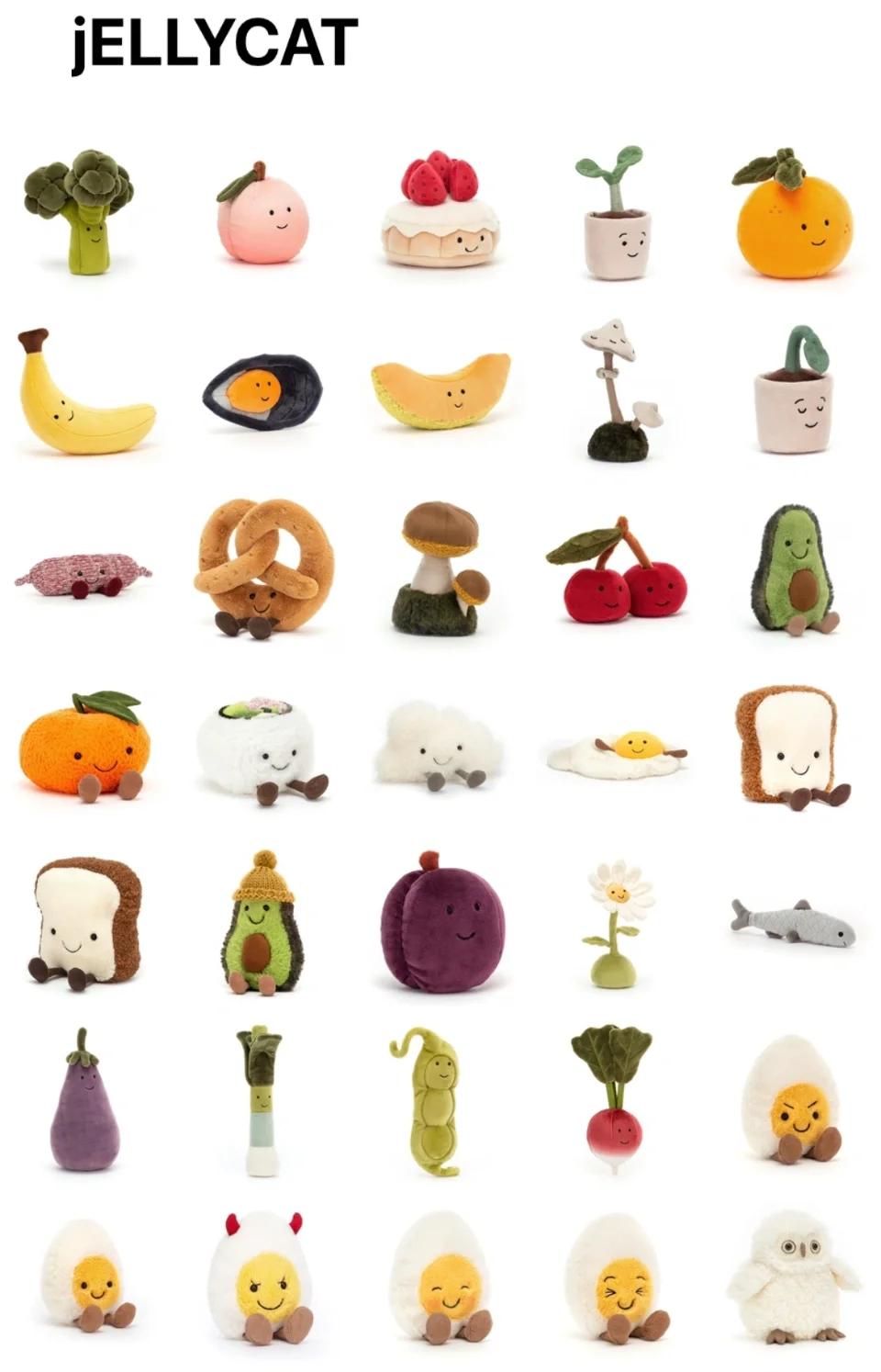 雖然這些玩偶,大多數與Jellycat不說一模一樣吧,那簡直毫無差別,基本都是“擬人化”後的產物,加上了標誌性的豆豆眼,以及一些可愛的小表情。