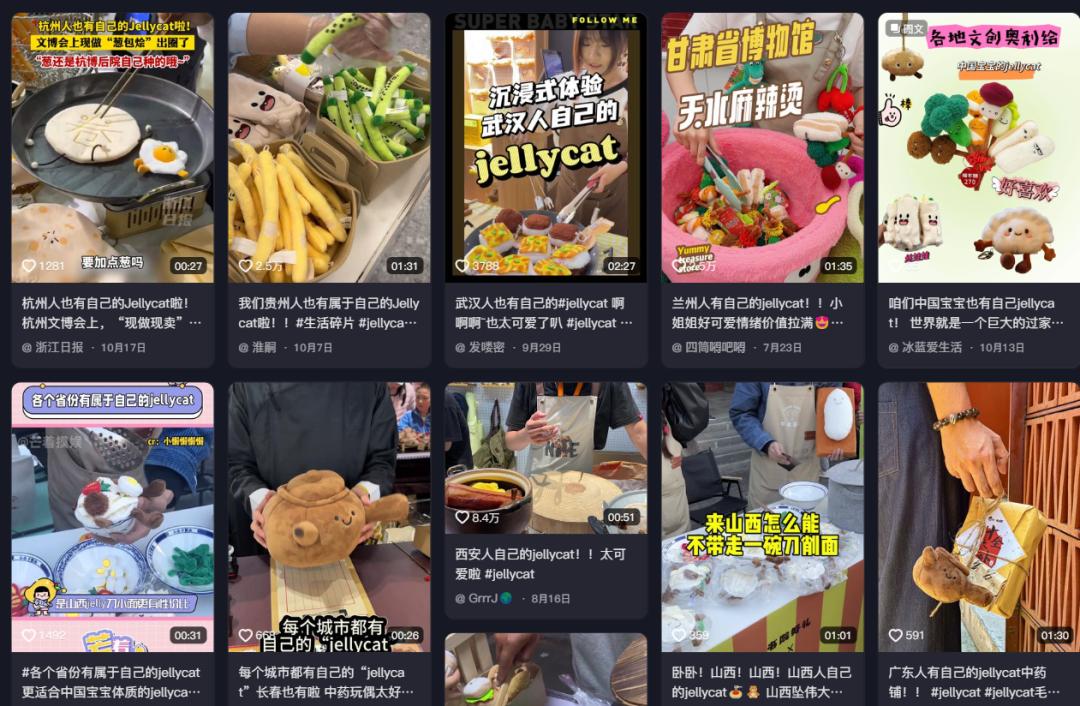 而它們也與麻辣燙、肉夾饃一樣,開始效仿起Jellycat這套毛絨+過家家的固定公式,甚至“xx有自己的Jellycat”的句式,也像”想你的風吹到了xx“一樣,成爲一種流量密碼。