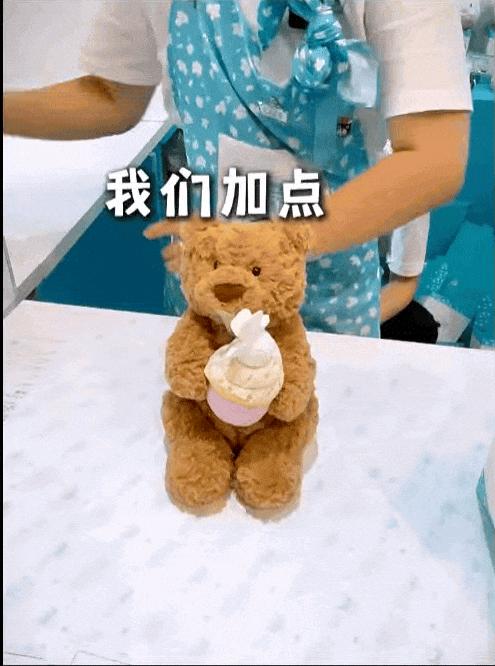手捧着蛋糕的巴塞羅小熊被店員從睡夢中叫醒,在送到客人面前時,會先給它精心地梳理好毛髮,然後爲它的蛋糕補上奶油頂。