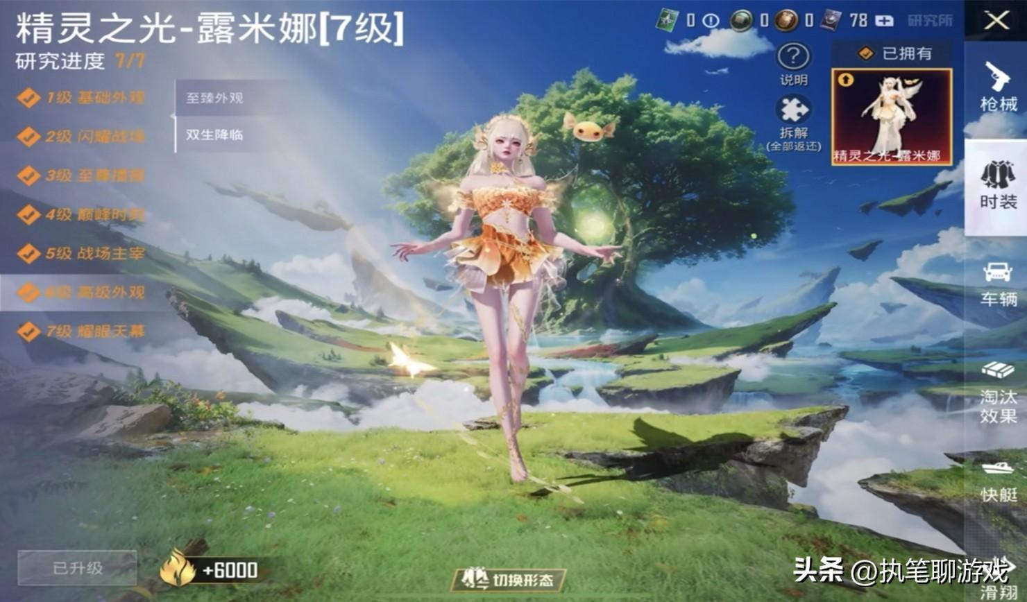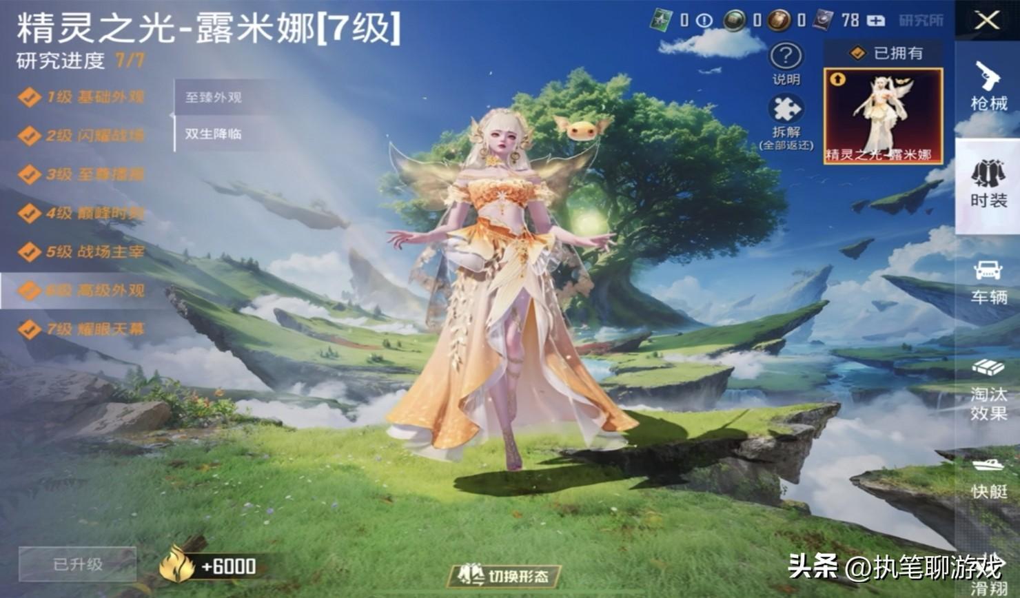 以1級外觀爲例,白色裙襬會自動變化爲黑色裙襬,兩種顏色交替變換;6級外觀爲例,則會從淺黃變成淺綠,不再只是單一的“部位”變化,而是全身套裝都會出現顏色變化,這種功能像極了動態特效,算是《和平精英》當中的第1個擁有該功能的神裝。