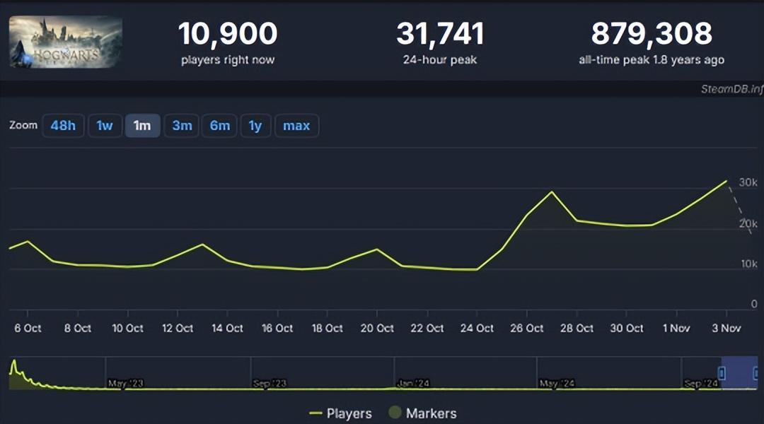 與此同時,《哈利波特》系列電影在重映票房破3億後,也間接帶火了《霍格沃茨之遺》的熱度,目前遊戲在線人數峯值已達到31741人,對於一款一年前的罐頭遊戲來說,這個成績可以說十分亮眼了。