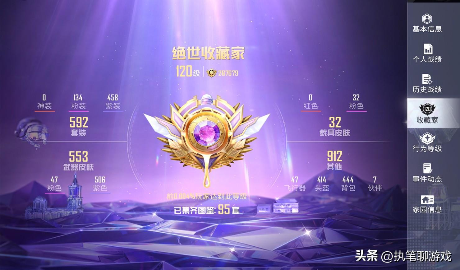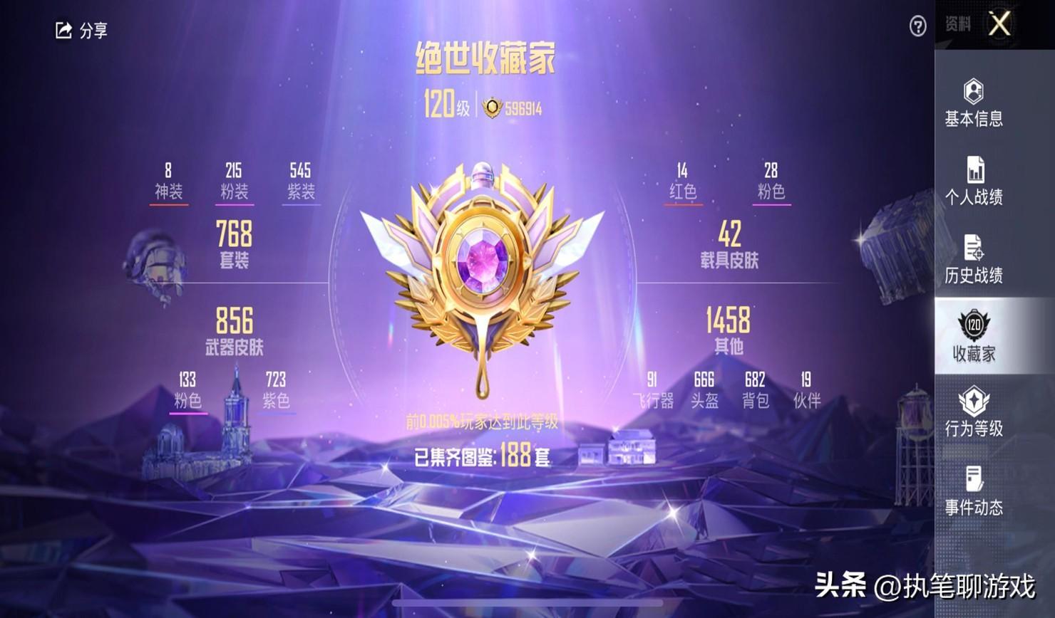 如圖所示,這位大佬除了8套紅裝外,還有215套粉裝、545套紫裝,升級槍高達133個,普通槍皮也有723個,而代表身份象徵的載具皮膚更是高達42個。