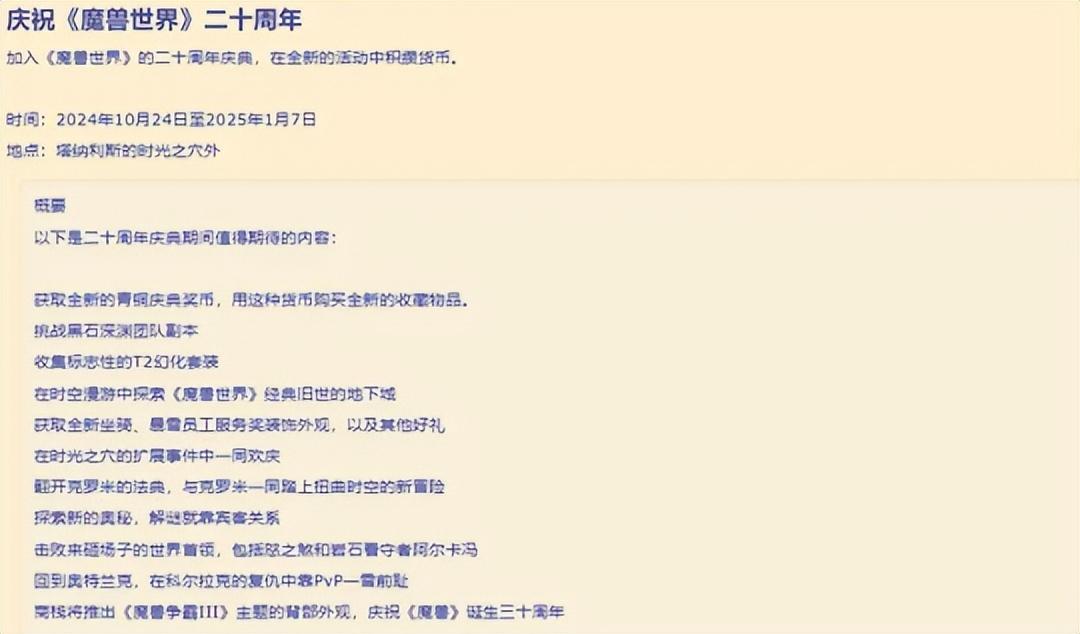 10月24日,《魔獸世界》迎來了遊戲二十週年慶典,遊戲也推出了相應的週年活動。