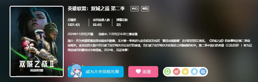 在11月9日,英雄聯盟衍生劇集《雙城之戰 第二季》正式開播。