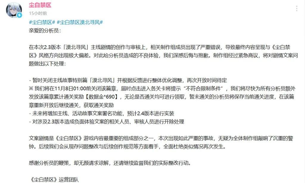 不過《塵白禁區》光速滑跪,不僅表示將對造成負面影響的文案開除,同時還將在下個版本實裝劇情文案署名功能。