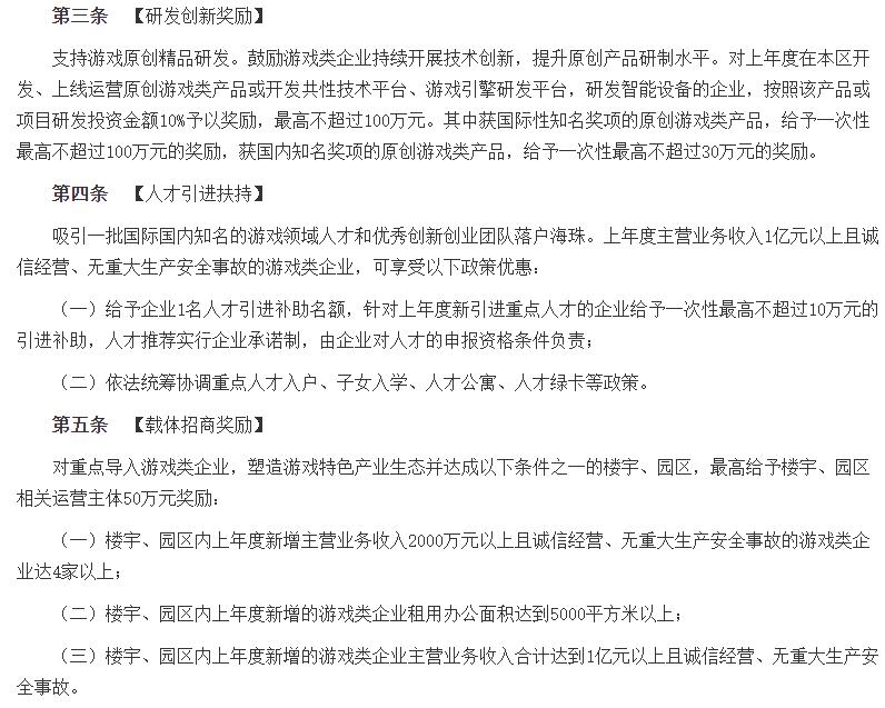 此次發佈的“遊戲產業16條”是對2022年版的修訂,將原來的條文進行了精簡,十六條中有六條是對於相關企業的具體資金獎補,包括研發創新獎勵、人才引進扶持、載體招商獎勵、辦公用房補助、企業規模化發展獎勵、活動扶持等。