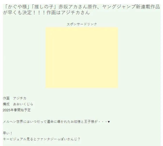 據速報消息,在《我推的孩子》漫畫完結後,赤坂明將作爲原作家,在2025年春開啓新作品連載,アジチカ負責作畫(《終末的女武神》)。