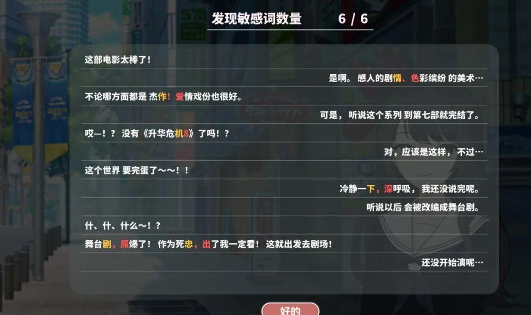 劇情裏會有大量櫻花妹的日常對話,你需要人肉識別“無意識的下頭詞彙”,把它們全部找出來,用鼠標射擊“說話注意點”。
