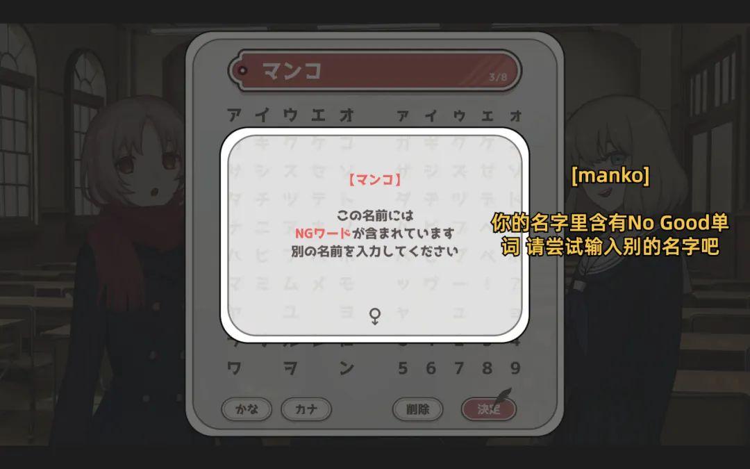 遊戲通關有一個結局①,前置條件就是在取名環節輸入敏感詞7次。一旦錯過了條件,那就只能重開一把,或者二週目回過頭再來打這個結局①(有提示)。