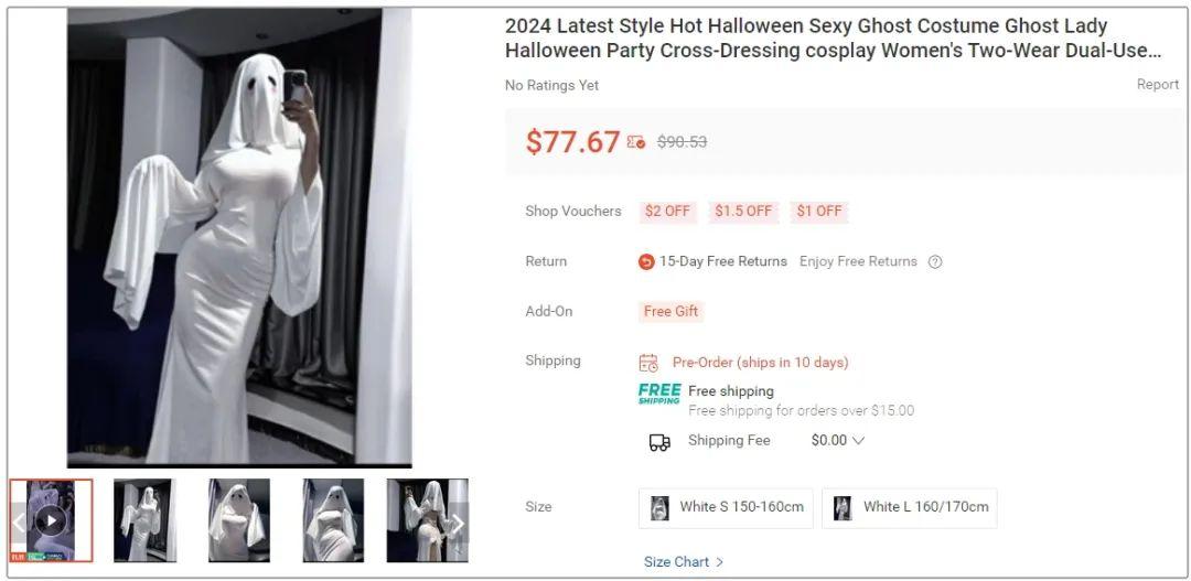 再後來,這套衣服甚至開始出征海外,文化輸出TikTok,讓上面出現一堆同款。你現在去一些海外購物平臺上搜索萬聖節服裝,會發現這套衣服甚至已經被打上了“2024年熱款”的標籤。