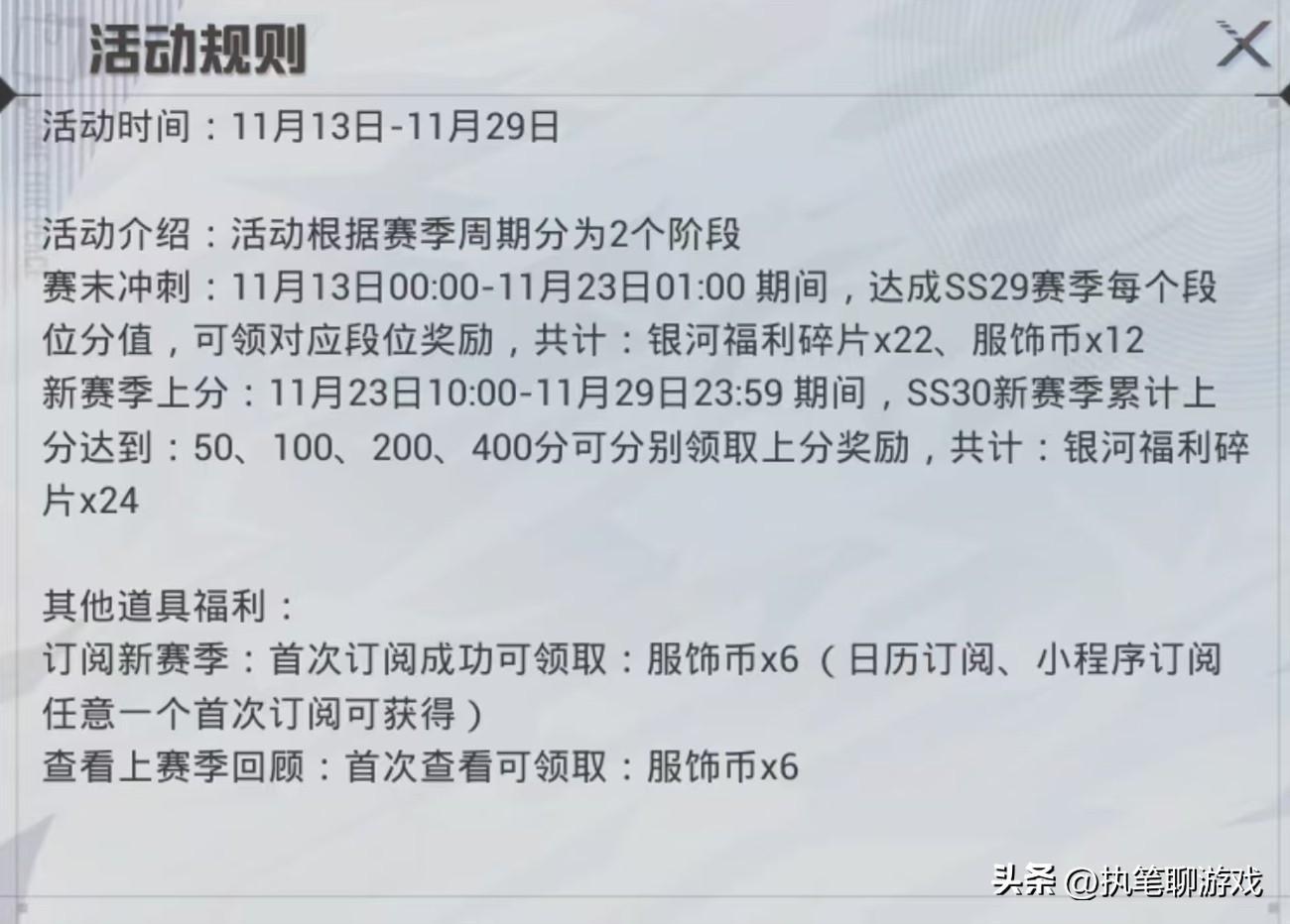 雖然賽季經過時間調整與時長優化,但是在“結算時間”方面還是按照老規律,通過“新賽季上分”可以看出:SS30賽季將會在11.23的上午10點正式開啓,同時還會獲得當前版本的銀河福利碎片。