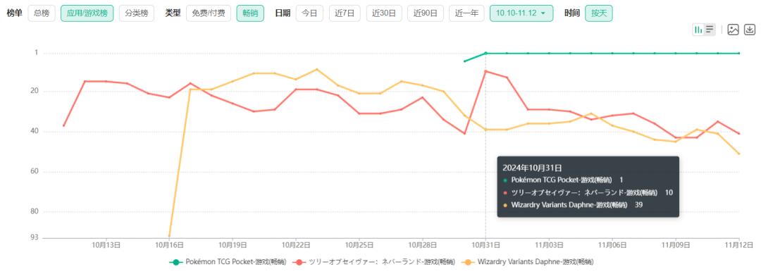 其中第一梯隊的《寶可夢TCGP》的表現形成了斷檔級別的優勢。這款產品在10月倒數第二天上線,於日本市場中先空降iOS暢銷榜第5位,然後才登頂iOS免費榜,似乎當地用戶的下載熱情比起付費熱情有點後知後覺的意味。