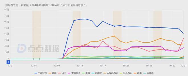 《救世者之樹:新世界》上線後,快速橫掃港澳臺市場,登頂當地iOS暢銷榜首,並在月末衝到韓國市場iOS暢銷榜第三位、日本iOS暢銷榜第10位。收入數據方面,10月這款遊戲的總流水約爲1.97億元,日本市場佔比排第三。