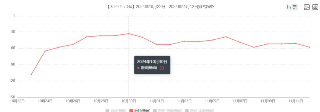 第三梯隊當中,日本本土產品《MLB PRO SPIRIT》是KONAMI出品的棒球題材產品,雖然能衝到暢銷榜第10位的高度,但波動幅度較大。紫龍游戲的《鋼嵐》在日本市場開服衝到暢銷榜25位,不過後續一路走低,還要看新版本是否有抬頭的趨勢。HABBY全球發行的《卡皮巴拉Go!》於多個地區闖進暢銷TOP10,而在日本地區則徘徊在暢銷榜30~60的區間,有點慢熱。