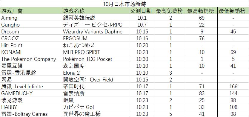 整體來看,10月日本市場的新品表現跨度非常大,有《寶可夢TCGP》這樣一直霸榜一直爽的寡頭,也有一時間有衝勁一時間又無力的波動型新品,但更多的還是一波流都算不上的炮灰,只能短暫在暢銷榜上走一遭。