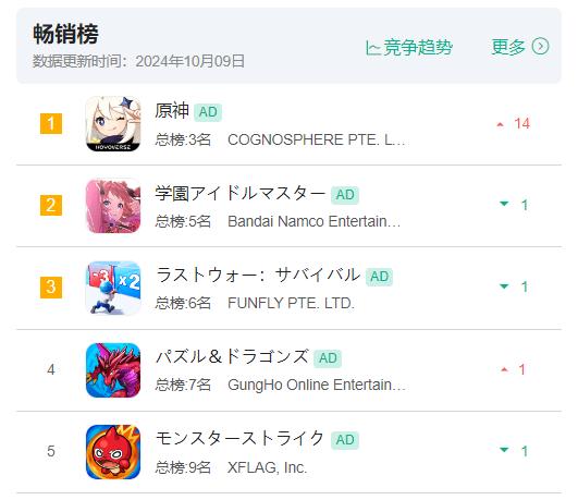 同樣在日本市場,不少國產大作也在國慶檔期發力,單看米哈遊就有10月3日衝到iOS暢銷榜第三位的《崩鐵》,以及10月9日登頂的《原神》。至於第二梯隊、第三梯隊發力的國產遊戲,就更多不勝數了。這在一定程度上擠壓了新品的生存空間,所以大家也默認避開了競爭最激烈的10月前半段。