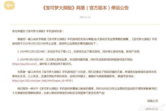 近日網易宣佈《寶可夢大探險》國服,因爲運營策略的調整,遊戲將於24年11月13日14時關閉下載和充值通道,2025年2月10日15時停運。