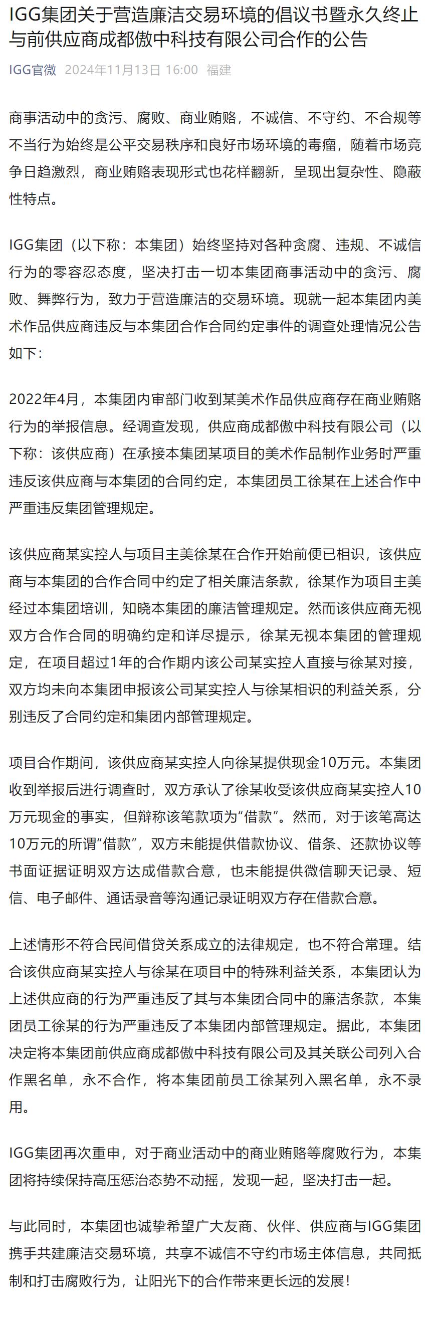 據通告描述,2022年4月,IGG集團內審部門收到商業賄賂行爲舉報。經調查發現,供應商成都傲中科技有限公司某實控人與IGG旗下某項目主美徐某此前便相識,存在「熟人發包」的情況,且在超過一年的合作期間內,雙方都沒有對此進行利益申報。不僅如此,在項目合作期間,該實控人還以「借款」爲由,向徐某提供了10萬元現金。