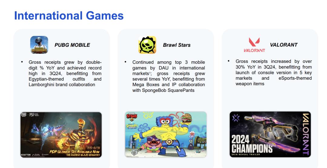 其他長青遊戲方面,《火影忍者》手遊今年5月日活躍用戶數達到1000萬,Q3季均日活躍用戶數再創新高;《無畏契約》是我們的第三大PC遊戲,Q3遊戲季均日活躍用戶和總收入再創新高。