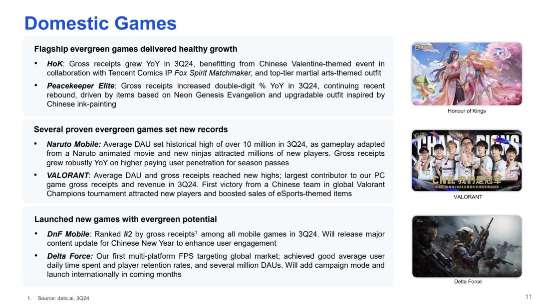 此外,我們推出了兩款新品。其中《地下城與勇士:起源》在Q3全球手遊中,按總收入排名第二。雖然第四季度該遊戲將進入鞏固階段(consolidation period),但相信國內春節的內容更新,會提高遊戲的用戶活躍度和盈利能力;《三角洲行動》9月遊戲上線後取得了不錯成績,DAU達到數百萬。