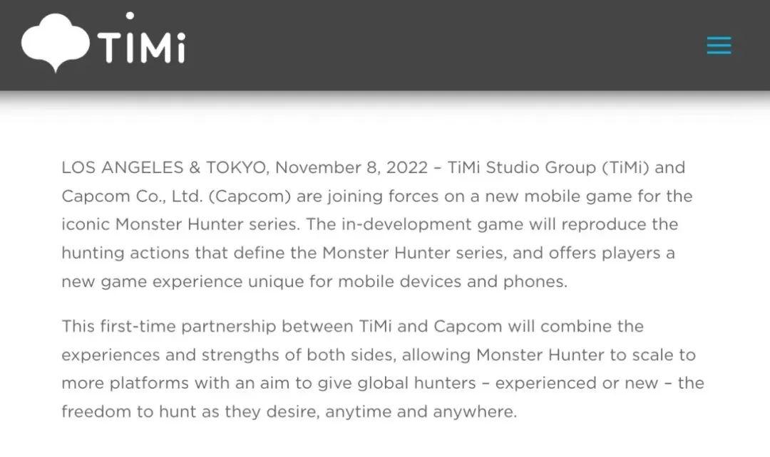 其實早在2022年11月,天美就曾對外公佈過,自己正與卡普空研發一款怪獵IP手遊。