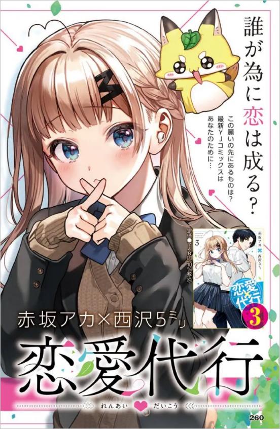 《戀愛代行》是去年赤坂與西沢5合作開的一本新連載,選了一個軍師教我談戀愛的點子。漫畫裏赤坂輸出了很多他自己的戀愛觀,可展開空間有限,前段時間腰斬掉了