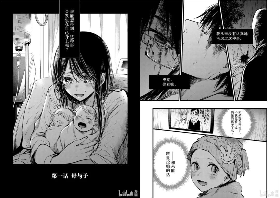 被人殺害的名牌大學婦科醫生雨宮吾郎,與在他手下病逝的女孩天童寺紗利奈,一起轉生成爲前世單推偶像星野愛的孩子,星野阿庫亞(阿誇)與星野露比(露比)。