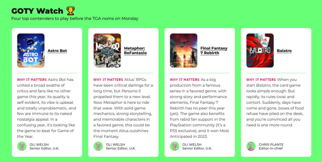 但從另一個角度看,TGA突然讓一個長期默認的規則成爲顯學,也是無奈之舉。事實上,今年如果沒有《黃金樹幽影》《最終幻想7重生》《寂靜嶺2重製版》等冷飯、拓展遊戲撐場面,提名名單可能會觀感慘淡。