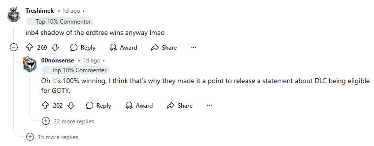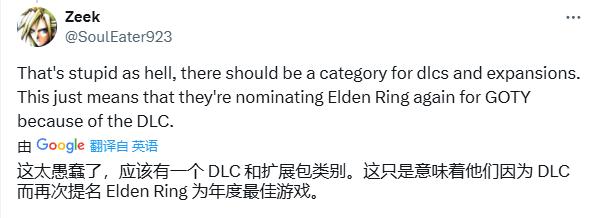 很多中外網友認爲,“臨時加規則”就是爲《黃金樹幽影》拿年度遊戲鋪平道路,但同時也會讓整個提名、頒獎都變得無聊,想象一下《黃金樹幽影》在各種聲畫獎項、年度遊戲裏提名,最後“名副其實”盡收囊中的場景...