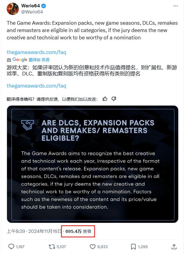 2016年,《巫師3》DLC“血與酒”就得到了年度最佳角色扮演遊戲;《最終幻想7重製版》拿到過兩個獎,《生化危機4重製版》曾入選了年度最佳遊戲提名;《原神》是在2021年——上線一年後拿的年度最佳移動遊戲。所以,新加的這條FAQ更像是對已有默認規則的補充說明。