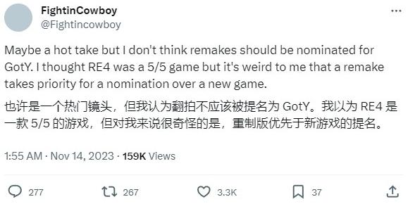其實,一直有反對的聲音,認爲重製版、DLC不該進入重要獎項的候選。去年《生化危機4重製版》被提名年度最佳遊戲時,就有人提出,重製版不應該比當年的新遊戲優先入選,還不如單獨搞個最佳重製遊戲獎項。