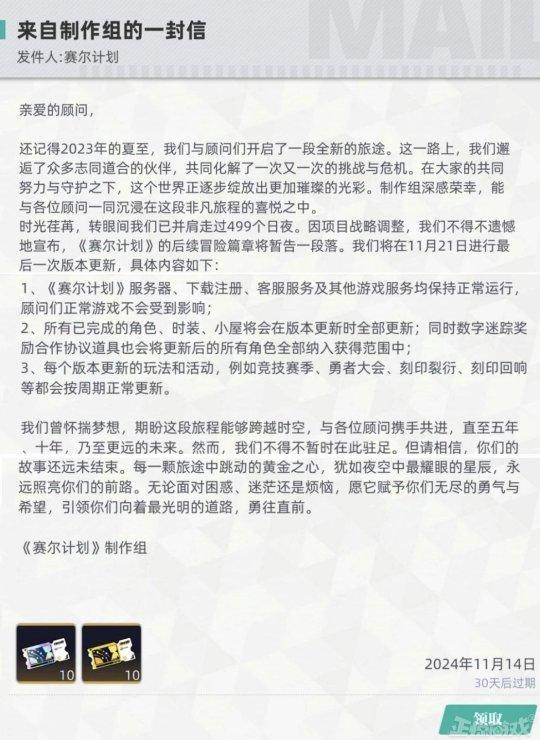 近日淘米旗下的回合制遊戲《塞爾計劃》宣佈,遊戲將在11月21日進行最後一次更新,遊戲可以照常註冊下載,其他服務也保持不變,競技賽季、勇者大會、刻印裂衍、刻印迴響等都會按週期正常更新,只是以後不會有內容更新,也就是《塞爾計劃》進日假死狀態。