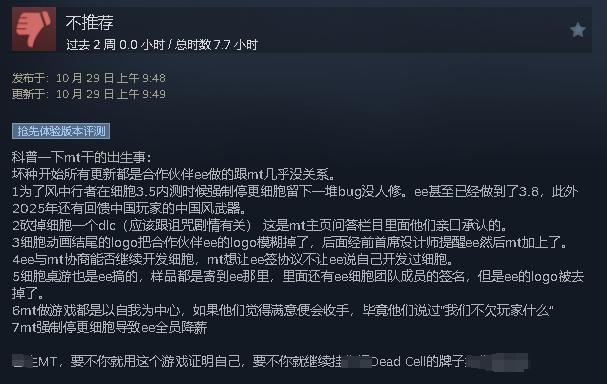 如果他所言非虛,MT的做法就真的莫名其妙,而且不太厚道了。因爲作爲合作伙伴,他們實際上一直未在商店等頁面註明EE這支團隊,卻利用IP方的權力中止了開發。而且很多玩家還發現,《風中行者》的宣發反倒有蹭《死亡細胞》的嫌疑……明裏暗裏種種事蹟,都讓老玩家們恨死了MT。