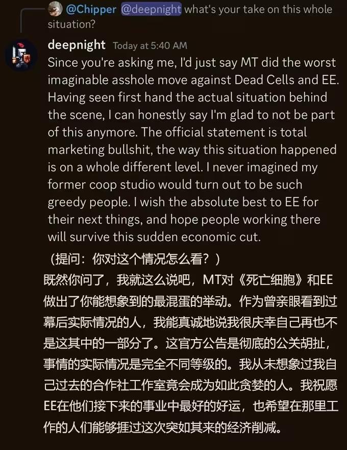 玩家們不明就裏,MT也沒有公佈具體原因。但《死亡細胞》的前主設計與主程、MT創始人之一Sébastien Benard,倒是在網上對MT開團,曝光他們是爲了給新作《風中行者》讓路,才強行中止了《死亡細胞》的開發。