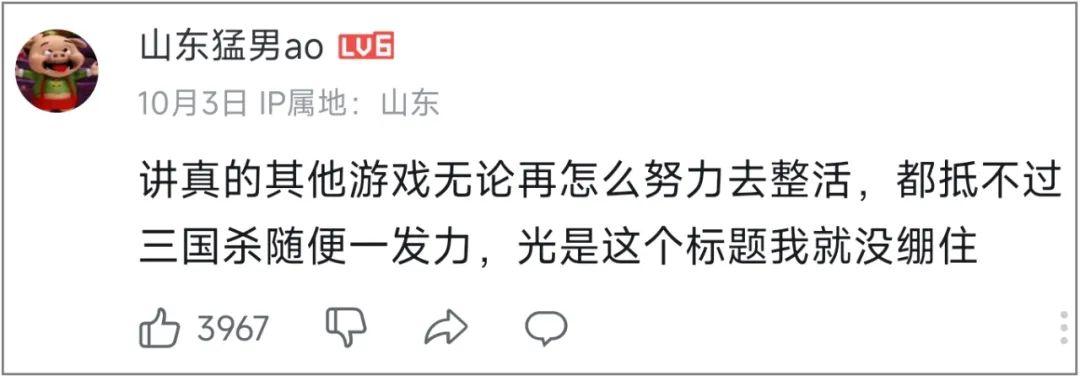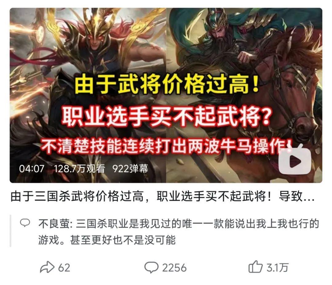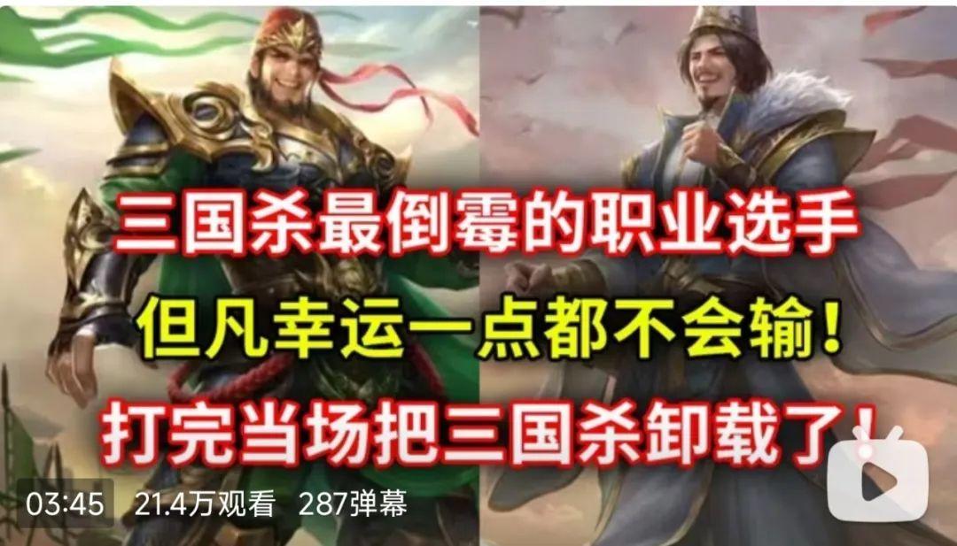 想象一下,電競比賽出現這種情況:職業選手因爲買不起新英雄,只能比賽中現場學習,導致做出下飯操作。相當於什麼呢?AME總決賽水人波高,是因爲他之前從來沒玩過這英雄;而Faker比賽從來不用皮膚,單純是因爲他真的買不起。這麼傻逼的事情,通常只會出現在《一覺醒來,全球XX水平下降10萬倍》之類的無腦爽文,或者印度新聞裏面。但是,別忘了我們國產遊戲中的口碑佼佼者。別人苦修十年釋放的究極大招,不過是這個遊戲隨手打出的平A罷了。事情是這樣的,《三國殺》最近又整了波好活,笑的我差點把米飯從馬桶裏噴出來。素材來自一位叫“山陽主薄”的UP主,那個讓人繃不住的視頻標題則是:《由於三國殺武將價格過高,職業選手買不起武將!導致在比賽連續打出兩波牛馬操作!》短短三行文字,就像一顆塞進你大腦中的黑洞,吸收了你全部的思考能力。它跨越了抽象和邏輯的分界線,任憑腦中千言萬語,匯聚到嘴邊終究成了那一句話——你們有沒有這樣的電競比賽啊?其實視頻內容沒啥好描述的,精髓都濃縮在標題裏了,真正神奇的大概就兩件事:其一,《三國殺》居然也搞了職業電競比賽;其二,堂堂職業選手,TOP中的TOP,真的會因爲搞錯最基本的技能機制,送掉飛龍騎臉的必贏局嗎?答案是真的有可能。換成任意一款其他遊戲,選手說不定都會因此陷入假賽風波。然而在《三國殺》的職業賽場上,這其實算不上多麼奇怪的事情。有一說一,《三國殺》可能還真算羣衆基礎最廣泛的“電競”比賽。畢竟十多年前面殺時代,這玩意的比賽在很多大學校園都風靡過,也沒什麼參與門檻。用當下的流行詞彙,應該管這叫頂級的鬆弛感。具體有多鬆弛呢,咱們從一些被上傳到B站的比賽切片就能窺探一番。比如曾有選手比賽打一半,突然從鏡頭下面掏出一碗飯開始大快朵頤,想必是被高強度的對局,過度消耗了大腦中的糖原。怎能不讓人想起電影《棋王》結尾,梁家輝飾演的“棋癡”張一生,連續與八名高手盲棋對戰後,因精疲力竭身體癱瘓的那份悲壯?此役無疑充分彰顯了《三國殺》作爲專業電競比賽,同時對選手智力和體能的超高要求。再比如某場比賽中,一位選出界關羽的選手進入比賽就開始掛機,全程讓人機代打。他是因爲高強度的比賽過度疲勞而昏沉睡去?還是賽前早已制定好的奇謀妙計?亦或者是一場AI搶走了人類話語權的智械危機?只可惜比賽中並未出現選手本人的鏡頭,一切真相都如同那淚水,永遠消散在了暴雨中。《三國殺》職業賽事曾有場名局,誕生了一位叫“章武大帝”的選手。這比賽是《三國殺》經典的1v2鬥地主模式,地主方選擇了防禦能力出色的吳國武將駱統,農民方則選出了擁有高爆發的張繡,和擅長給隊友喂牌的輔助角色謀劉備,一來二回形成了剋制關係,優勢在農民。特別當遊戲進行到中期,農民方張繡手中拿到3張殺,而劉備也拿到2張殺的時候,實際上只要劉備發動技能“仁德”,把自己的手牌送給張繡,地主駱統就會被一波帶走,遊戲已經可以直接宣佈勝利了。別說職業選手,換成我奶奶來都能穩贏,不誇張。然而劉備選手接下來的頂尖微操,其實就淋漓盡致展現了《三國殺》作爲職業電競項目的操作上限,以及智力、體力、心理學、傳媒學等多領域的複雜博弈。先記好嘍,他不是一位普通的劉備,他是有功的劉備,是《三國殺》近兩年新出的究極無敵擴展包謀攻篇中,設計的加了“謀”的劉備。謀劉備多了一個叫“章武”的限定技能,效果是強制讓被你之前餵過牌的角色,反過來給你牌,是一個後期用來清場的技能。有點像收高利貸,劉備將軍的恩情還不完,非常霸氣。手握我奶奶都能贏的大好局勢,我們的謀劉備選手此時卻彷彿被三體人腦控,毅然發動了章武這枚核彈,瞬間收走隊友的全部手牌。這就相當於該選手在足球比賽傷停補時階段的最後一分鐘,抓住了唯一的機會,打進了決定比賽勝負的絕殺進球——然而他踢進去的是自己家球門。很多人肯定會覺得,章武大帝這波操作純下飯,但實際上你們誤會了,這場對局,才真正詮釋了爲什麼《三國殺》能成爲全民桌遊,是高智商遊戲。如今越來越多的電競遊戲發展到後面,幾乎都是BP決定了一切,開場打一波優勢,接下來的比賽就都是垃圾時間,比賽套路愈發固化,讓遊戲陷入慢性死亡的僵局。而《三國殺》的職業比賽,就不是這樣的。不到最後一刻,你永遠不知道局勢會往哪邊傾斜,永遠保持着懸念。更重要的是,章武大帝作爲頂尖職業選手,他的操作還激勵了很多普通玩家,認爲自己也可以打出職業水平,每個人都有資格在最高舞臺上,閃耀自己的電競夢想。《三國殺》最高殿堂裏,還收錄着許多震撼人心的名局,遺憾時間有限,無法爲大家一一呈現。但相信我,僅僅通過這些標題,你就能感受到一股氣,從湧泉穴直衝天靈蓋,會完全打穿你對競技體育的刻板印象。這背後,蘊含着上下五千年一脈相承的智慧、勇氣、技巧,和麪對命運的決心。你能在其他任何一款電競遊戲裏,找到替代嗎?好吧我實在編不下去了,讓我們重新回到開頭的兩個問題:《三國殺》什麼時候搞了職業比賽,以及,職業選手真的賣不起遊戲裏的武將?嚴格來講,《三國殺》職業電競賽事早在2016年就成立了,叫SCL聯賽,分爲常規賽、季後賽和總決賽。乍一看,其實真的挺專業。在SCL之下,還有次級聯賽SDL、校園電競(王者之戰高校聯賽)、全民電競(全民公開賽)