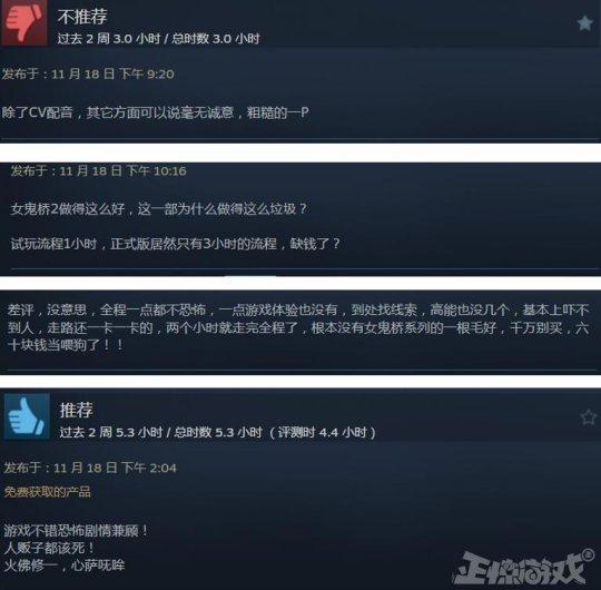 有差評玩家表示,除了CV配音,其它方面可以說毫無誠意,粗糙的一P。還有網友吐槽,《女鬼橋2》做得這麼好,這一部爲什麼做得這麼垃圾?試玩流程1小時,正式版居然只有3小時的流程,缺錢了?還有網友直接開噴,全程一點都不恐怖,一點遊戲體驗也沒有,千萬別買,六十塊錢當餵狗了!