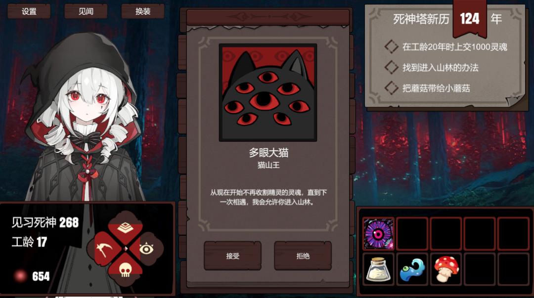 你將扮演一位見習期死神,收割靈魂償還債務。隨機的抉擇事件爲你提供多種選擇……遊戲玩法屬於王權Like,需要保持小死神的四個屬性互相平衡,解決事件,持續推進。