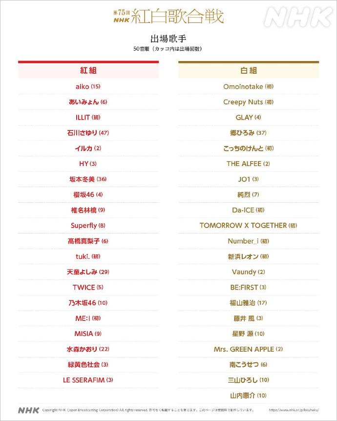 第75回NHK紅白歌會出場歌手名單正式揭曉。