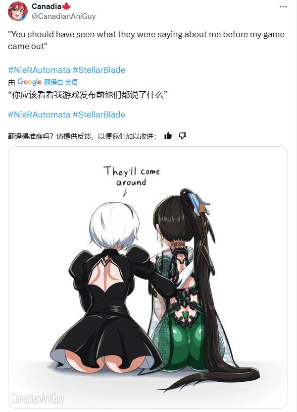 在《劍星》發售之前,因爲女主的外貌、身材,遊戲引發了不少爭議。曾有畫師畫了2B給伊芙加油打氣的應援圖。沒想到這倆遊戲最後還聯動了。