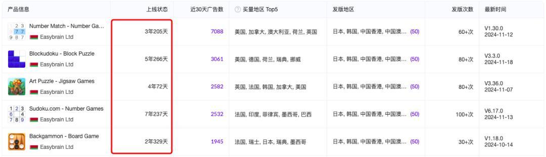 另一方面,這些玩法多聚焦智力挑戰,規則看似簡單,但內容深度卻能夠支撐玩家長期遊玩,具備較強的可持續性,因此生命週期往往比較長。除了上線近 8 年的《Sudoku.com》,Easybrain 目前廣告投放前三的產品,最年輕的《Number Match》也運營了近 4 年。