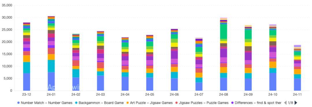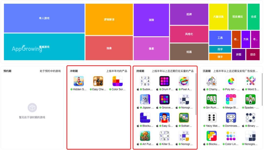 讓我們把目光投向 Easybrain。通過 AppGrowing 國際版 的“全球發行洞察”功能可知,Easybrain 旗下游戲以數獨、填字、拼圖等休閒玩法爲主。