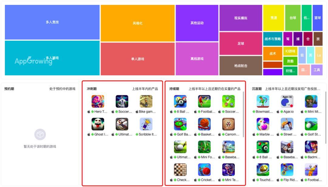《8 Ball Pool》成功後,Miniclip 看上了球類賽道的可能性。通過 AppGrowing 國際版 的“全球發行洞察”功能可以看到,除了檯球,Miniclip 目前主推的產品還涉及棒球、高爾夫、足球等球類運動。