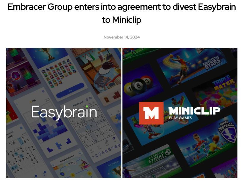 近期,騰訊子公司 Miniclip 宣佈將以 12 億美元(約合 86 億人民幣)的價格從 Embracer Group 手上收購 Easybrain,交易細節已經敲定,預計在 2025 年初完成。