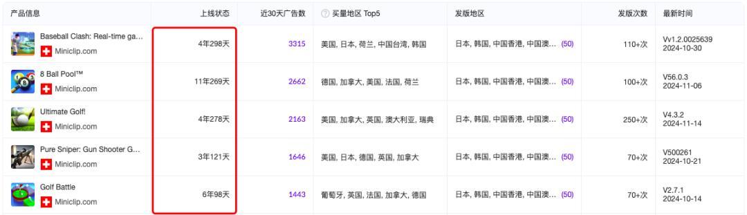 如果查看 Miniclip 目前在投的幾款主力手遊,就會發現它們都是運營多年的老產品。除了上線近 12 年的《8 Ball Pool》,近一個月廣告投放第一的《Baseball Clash》和第三的《Ultimate Golf!》都是運營近 5 年的長線產品。